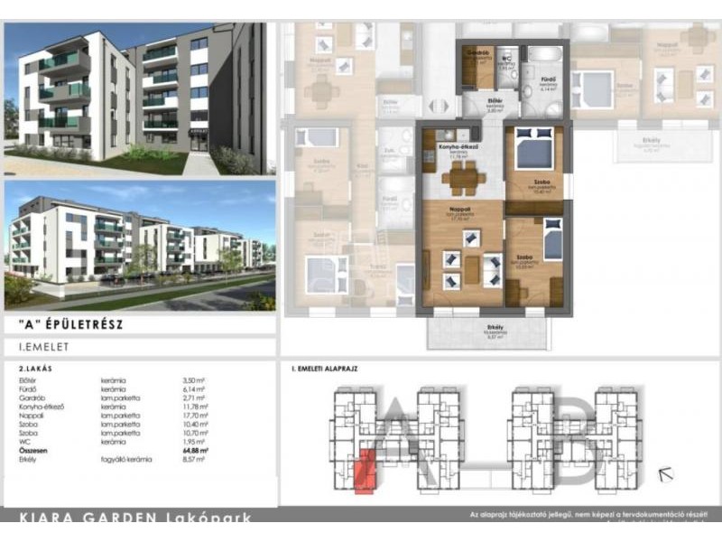 Szombathely zöldövezeti, dinamikusan fejlődő városrészén, energiahatékony, modern lakások várják új tulajdonosaikat. Kiara Garden lakóparkban kettő ütemben épülő , minden igényt kielégítő lakásai nappali+1 szobával, nappali+2 szobával, nappali+ 3 szobával fognak rendelkezni. Az ingatlanokhoz nagy erkélyek teraszok is tartoznak. A legnagyobb lakás dupla komfortos kialakítású lesz. Egyedülállóktól a nagy családosokig megfelelő otthona lehet bárkinek. A belváros közeli ingatlanok lehetőséget biztosítanak egyedi belső kialakításokra. A lakás gazdaságos fűtéséről és melegvíz ellátásáról távhő szolgáltató gondoskodik. A fűtésrendszer egyedileg szabályozható, saját hőmennyiség mérővel ellátott. A hőleadás padlófűtésen keresztül történik. Az ingatlanok ideális hőmérsékletét, a nappaliban elhelyezett split klíma biztosítja. Az épületben kellő számú zárható tároló kerül kialakításra, külön bejárattal. ( 2.96 m2-es tároló 1 790 000 Ft ) Természetesen vannak nagyobb tárolók is. A lakótömbök udvarán található felszíni parkolók ára 1 490 000 Ft. Bővebb tájékoztatásért kérem vegye fel velem a kapcsolatot.