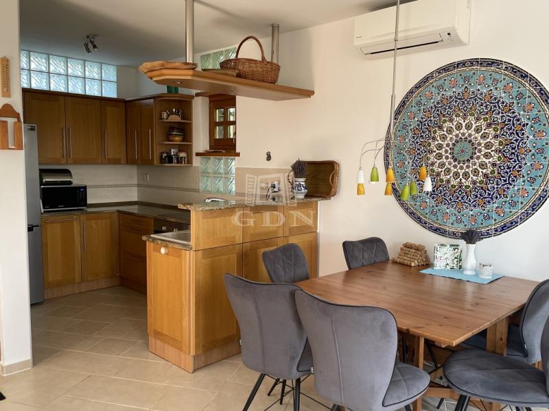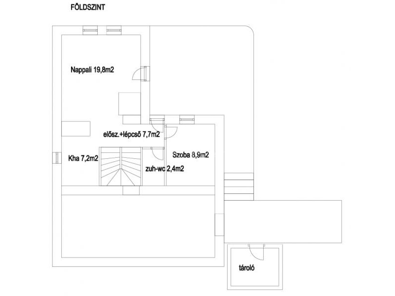 Földszint: nappali + étkező (19,8 m²) + konyha (7,2 m² ) légtérben split klímával, vendégszoba (8,9 m²) + zuhanyzós fürdő (2,4 m²)