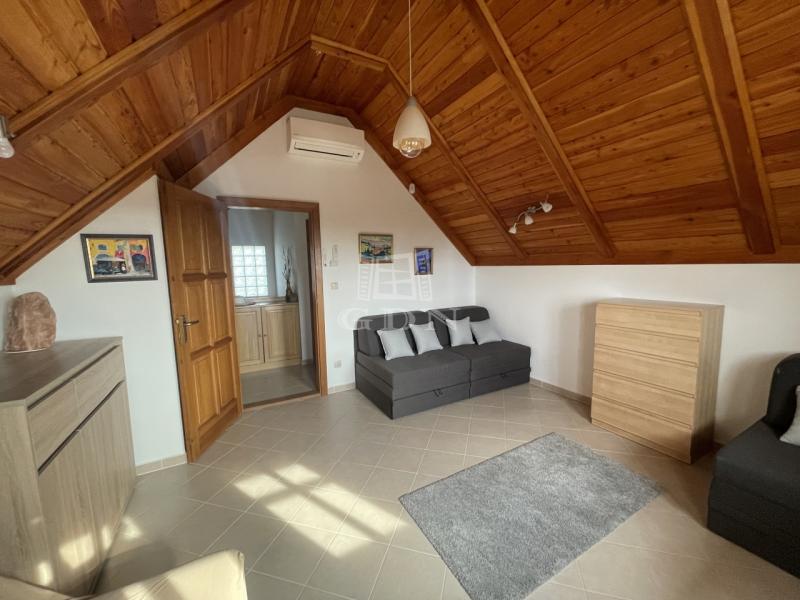 Kiegészítők: sütőfunkciós cserépkályha, infraszauna, félköríves terasz (25 m²), melynek burkolata felújításra szorul, így lehetőséget biztosítva a további egyéni igények kialakítására.