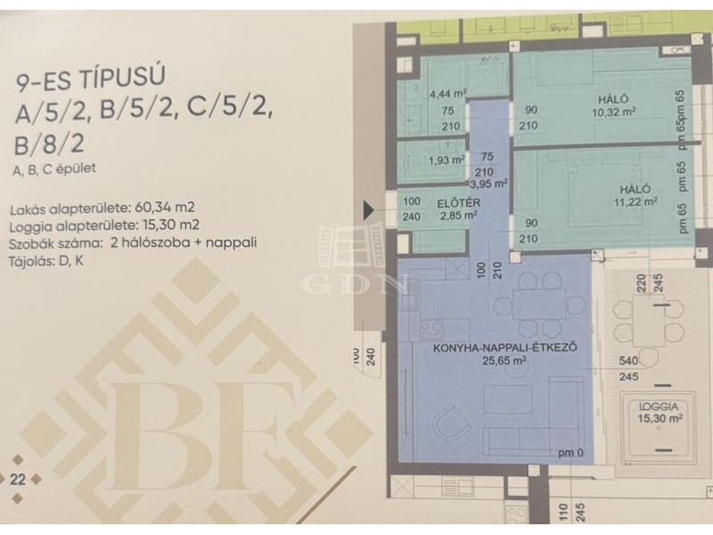 Az A/5/2-es típusú első emeleti osztott lakás 60,34 négyzetméteres, tartozik hozzá loggia amely alapterülete 15,30 négyzetméter. A 60,34 négyzetméteren amerikai konyha, 2 hálószoba, nappali, fürdőszoba, valamint külön WC is található. A loggián napozhat vagy akár egy jakuzzit is telepíthet. Az ingatlanhoz mélygarázsok és tárolok is megvásárolhatóak.