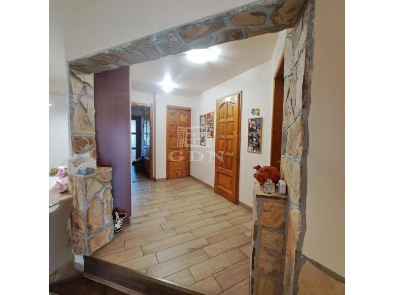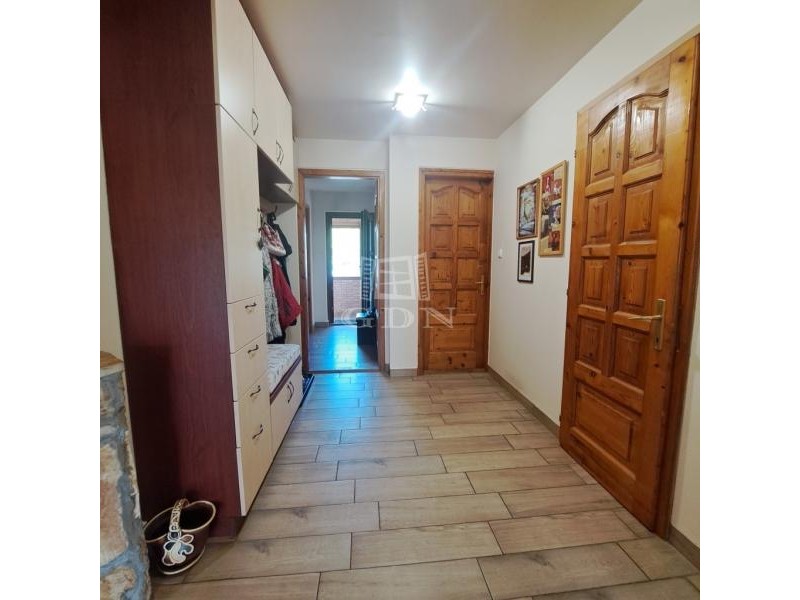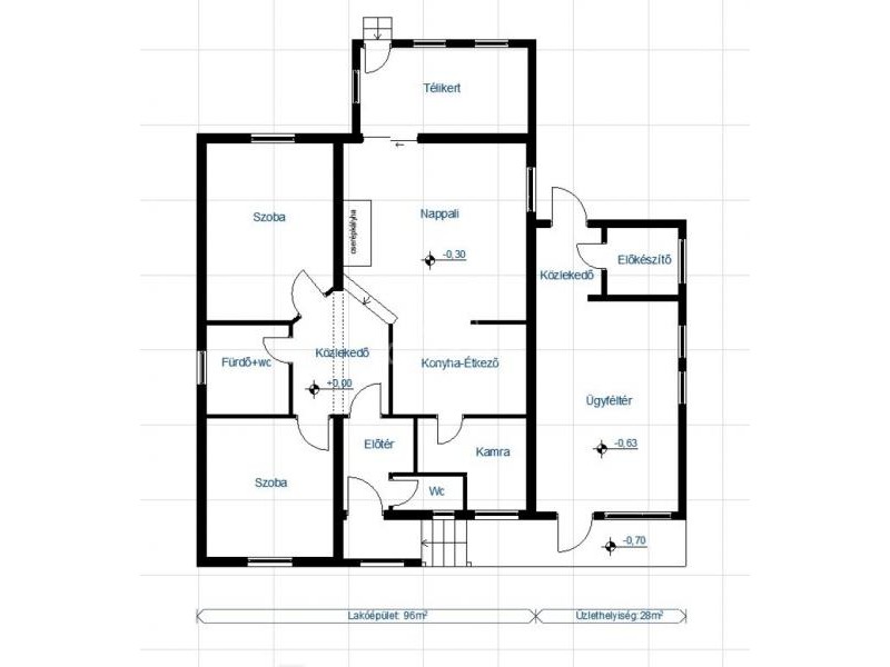 - A lépcsős és fedett bejáratról az előtérbe jutunk. Innen nyílik a 2 szoba, az amerikai konyhás nappali; a nappaliból nyíló télikert, a fürdőszoba és WC.