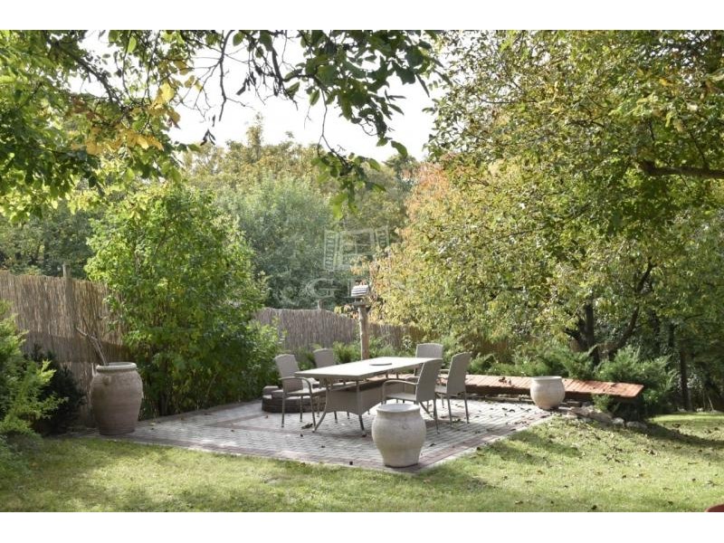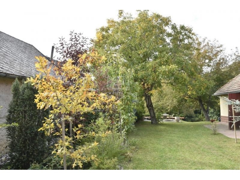 A gondosan megtervezett udvarban gyümölcsfák, bokrok, örökzöldek és virágok teszik idillivé a környezetet. Egy mediterrán hangulatú, fedetlen szaletli hív pihenésre, a telek alján pedig egy kis patak csörgedezik, tovább fokozva a természetközeli atmoszférát.