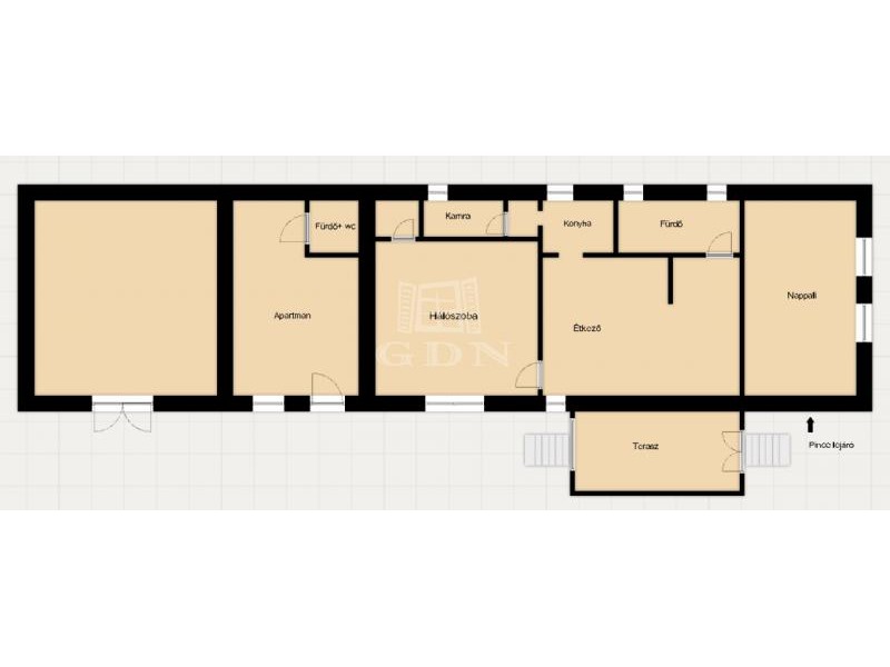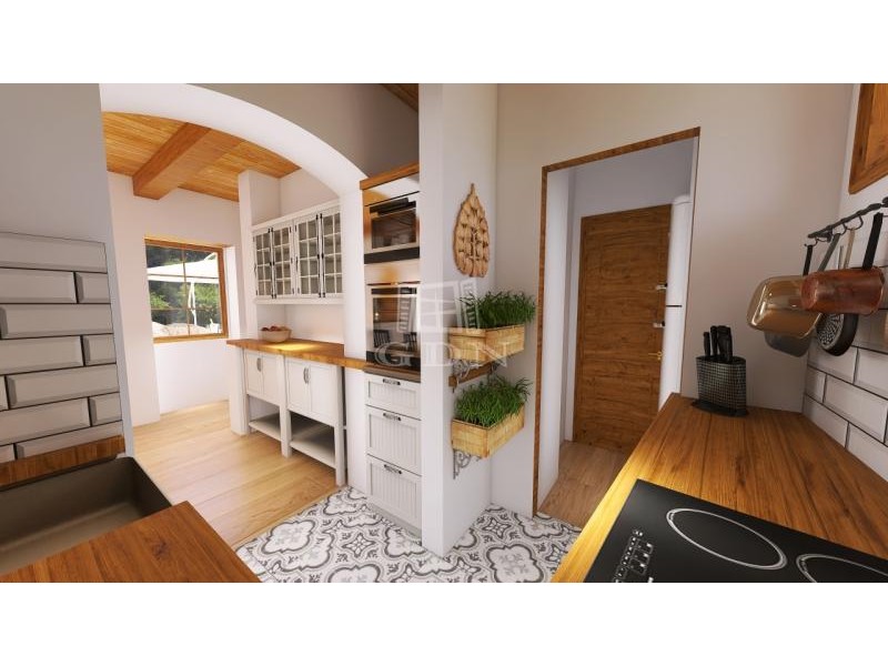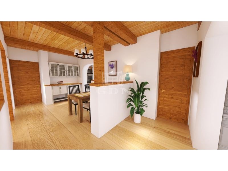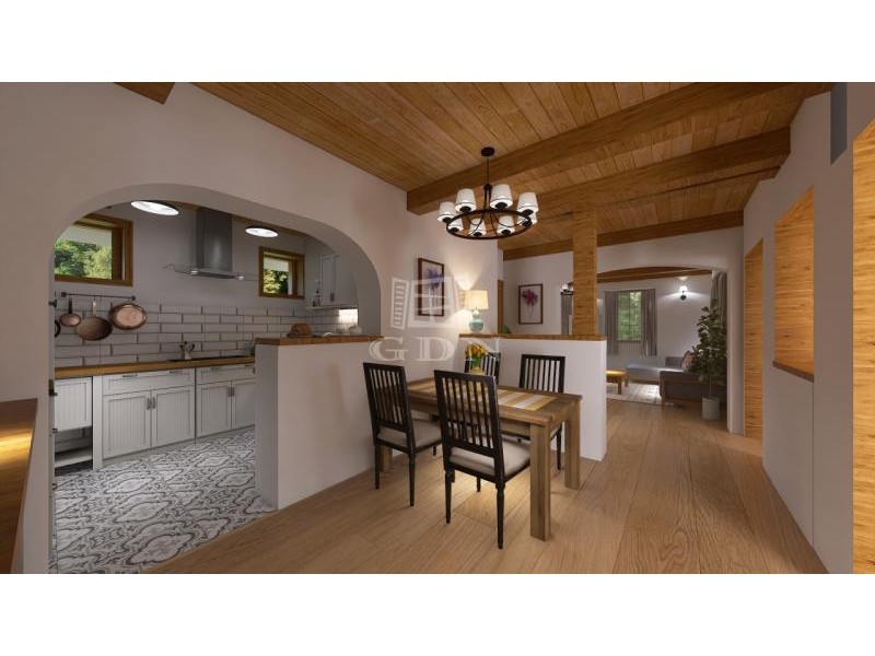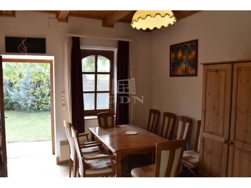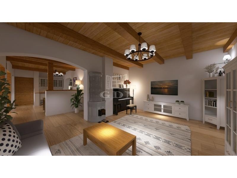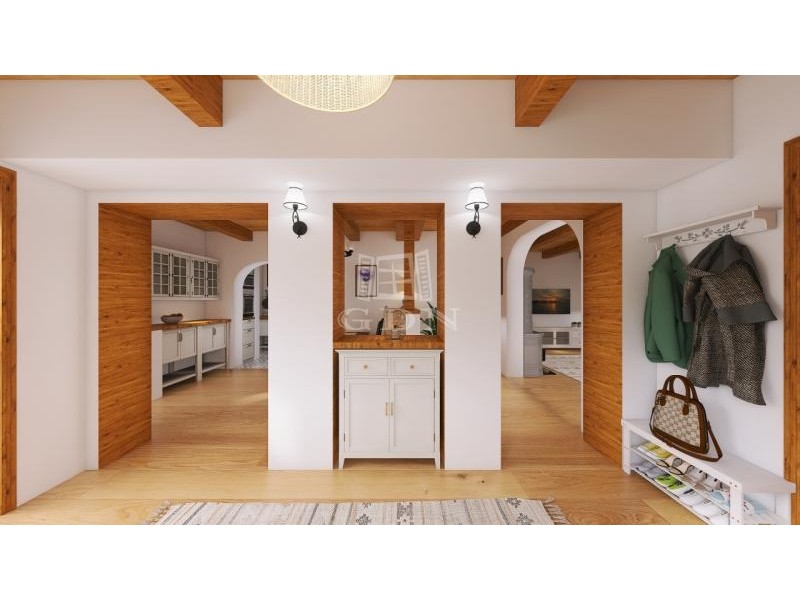 A lakrész egy hangulatos teraszból, utcafronti nagy nappaliból, étkezőből, konyhából, tágas hálószobából és fürdőszobából áll. Az eredeti, százéves gerendák gondos felújításon estek át, megőrizve a ház autentikus báját.