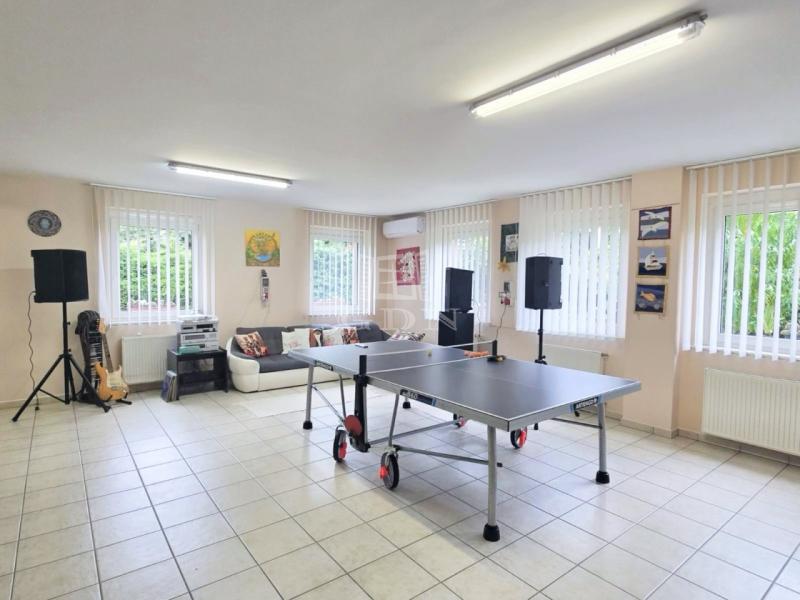 Az alsó szint jelenleg szabadidős tevékenységre alkalmas hatalmas méretű helyiség, valamint itt kapott helyet a kazánház, egy teakonyha, toalett és az autó beállására alkalmas garázs is.