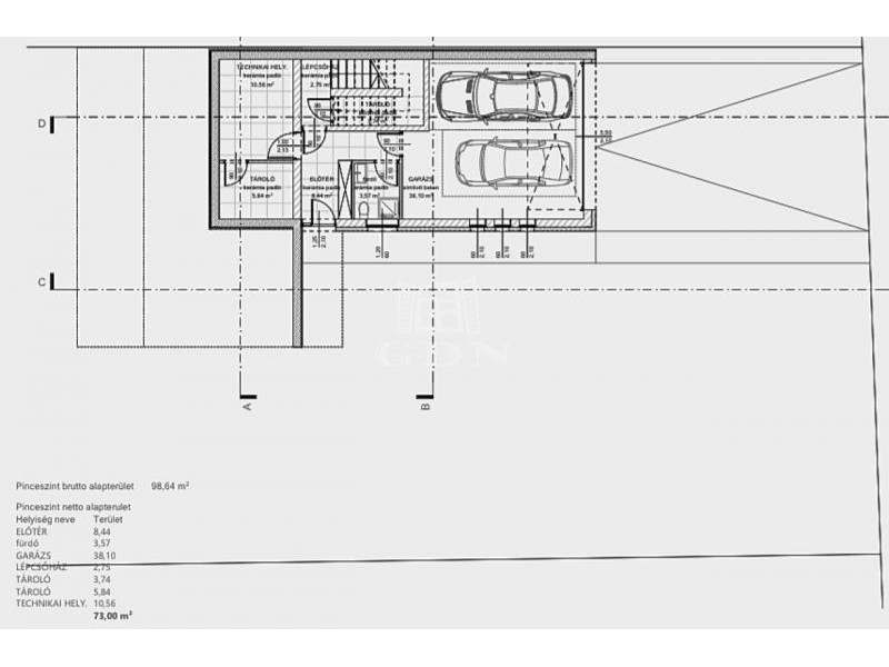 Az alsó szinten található 38 m²-es dupla garázs, valamint további helyiségek – előtér, fürdő, tárolók és gépészet – biztosítják a funkcionalitást és a rendezett életteret.
