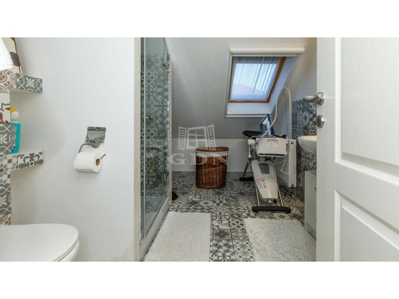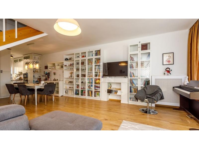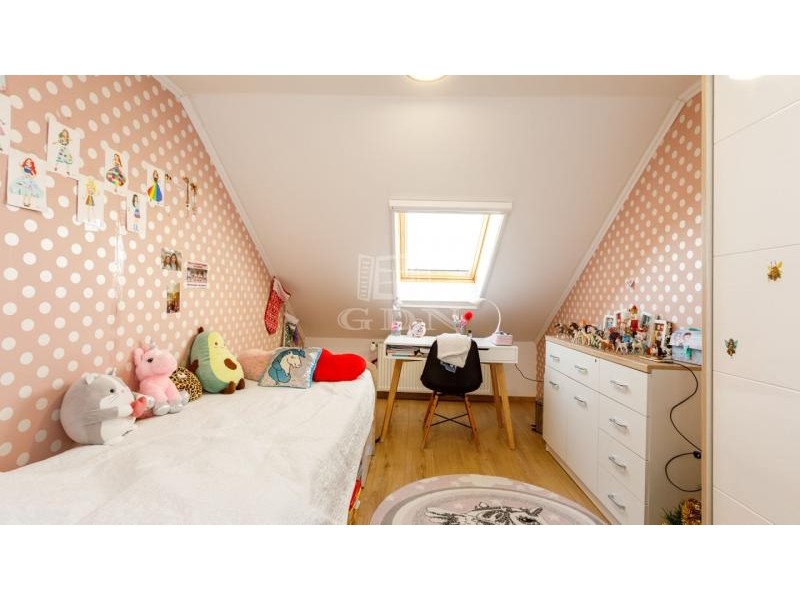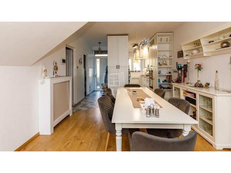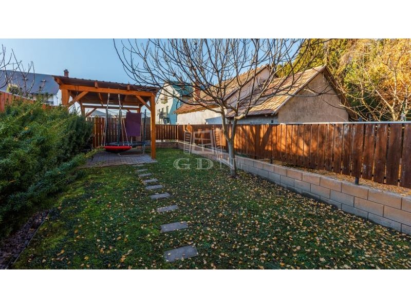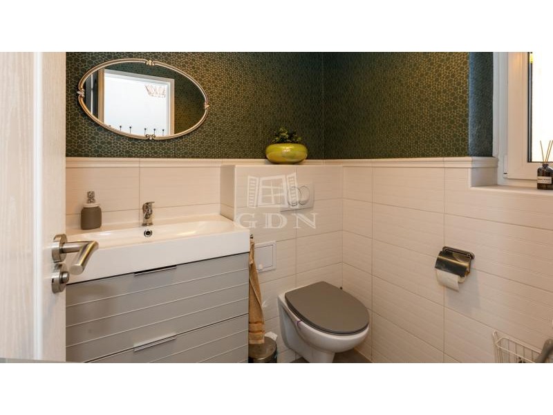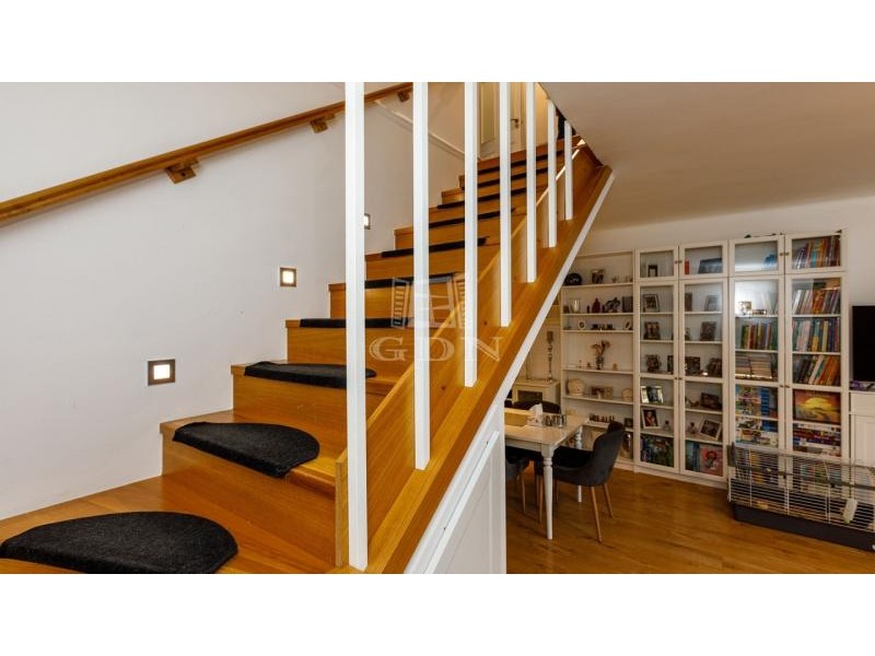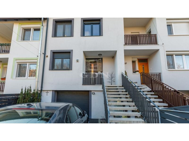 Ez a téglaépítésű ingatlan több szinten kínál tágas életteret, gondosan megtervezett belső terekkel. A földszinten egy szoba, konyha, tároló és fürdőszoba került kialakításra míg a többi három szinten további öt szoba, egy nappali egy konyha és két fürdőszoba áll rendelkezésre. A házhoz egy kertre néző erkély is tartozik az első szinten. Az autók elhelyezése garázsban és a ház előtt lehetséges.