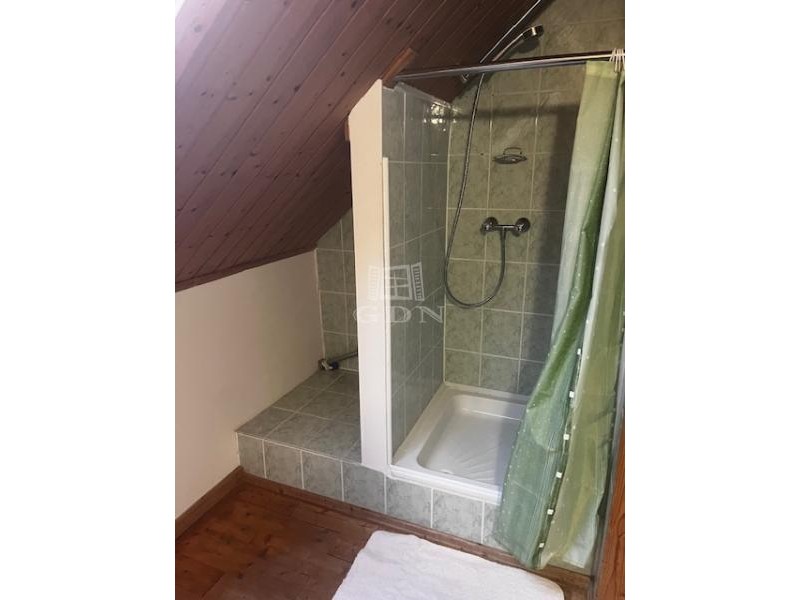 Fürdőszobájában zuhanykabin, wc,mosdókagyló és falraszerelt hajszárító van beépítve.