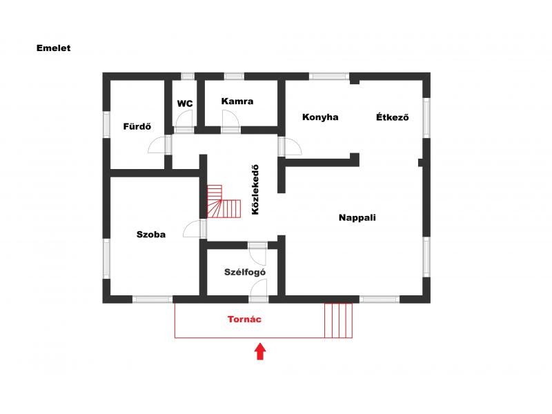 - elosztása: nappali + konyha + étkező, 1 szoba, szélfogó, fürdő, WC, kamra, közlekedő