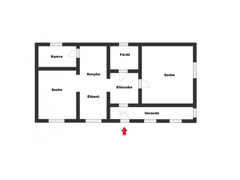- 2 szoba, konyha + étkező, előszoba, fürdő, kamra, veranda elrendezésű