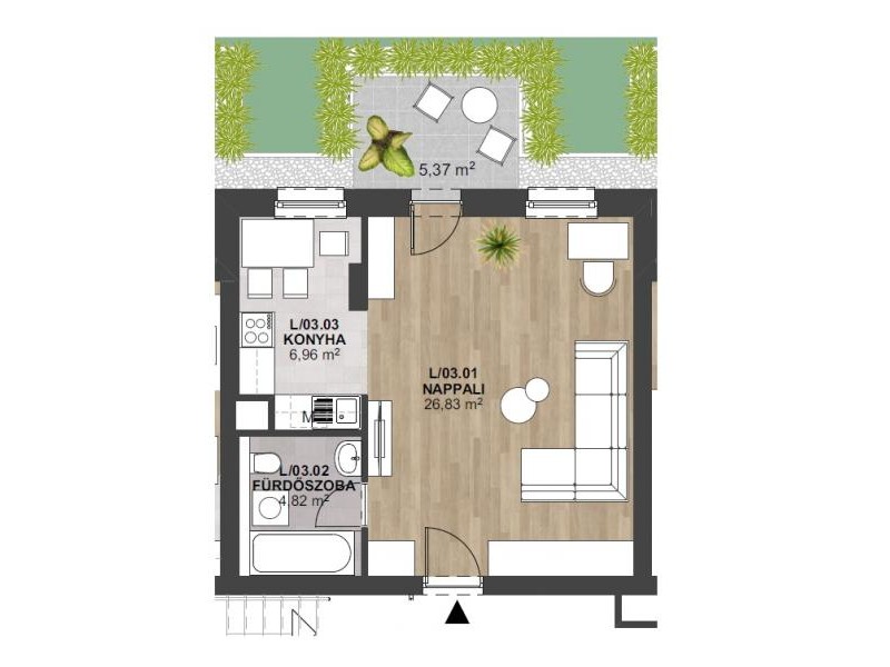 Hirdetésben szereplő stúdió lakás 38,61 nm alapterületű, melyhez 5,37 nm terasz tartozik, 1. emeleten található és déli tájolású. Részletes helyiség lista és elrendezése az alaprajzon megtekinthető.