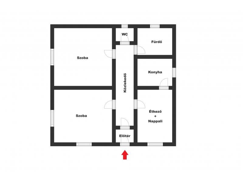 - elrendezése: 2 szoba, nappali + étkező, konyha, fürdő, WC, előtér, közlekedő