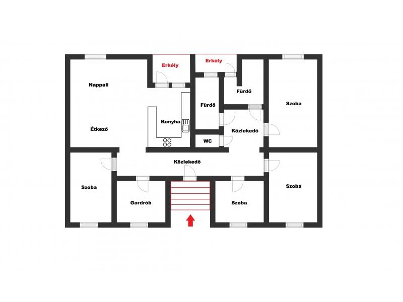 - elosztása: konyha + nappali + étkező, 5 szoba, 1 fürdő +WC, 1 fürdő, 1 WC, közlekedő, 2 erkély