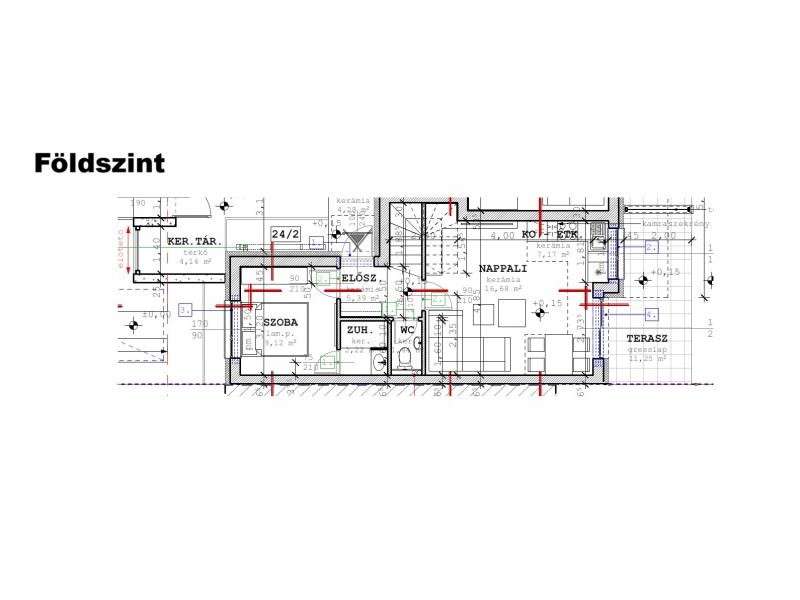 - földszint elosztása: előszoba, nappali, konyha + étkező WC, zuhanyzó, szoba, terasz