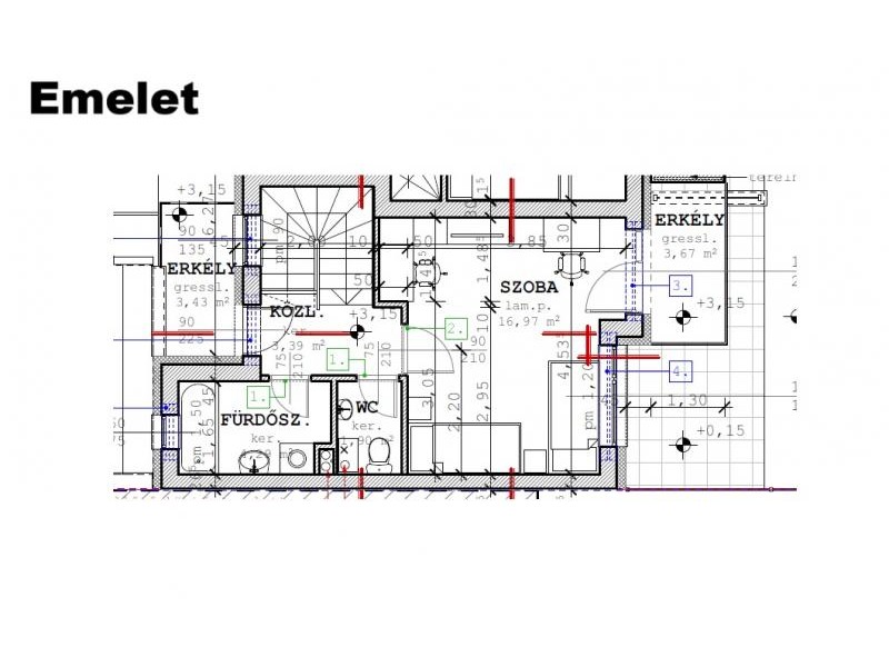 - emelet elosztása: szoba, közlekedő, fürdő, WC, 2 erkély