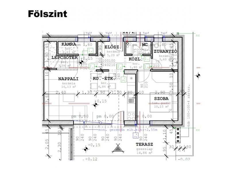 - földszint elosztása: előszoba, lépcsőtér, közlekedő, konyha+ étkező+ nappali, kamra, WC, zuhanyzó, szoba, terasz
