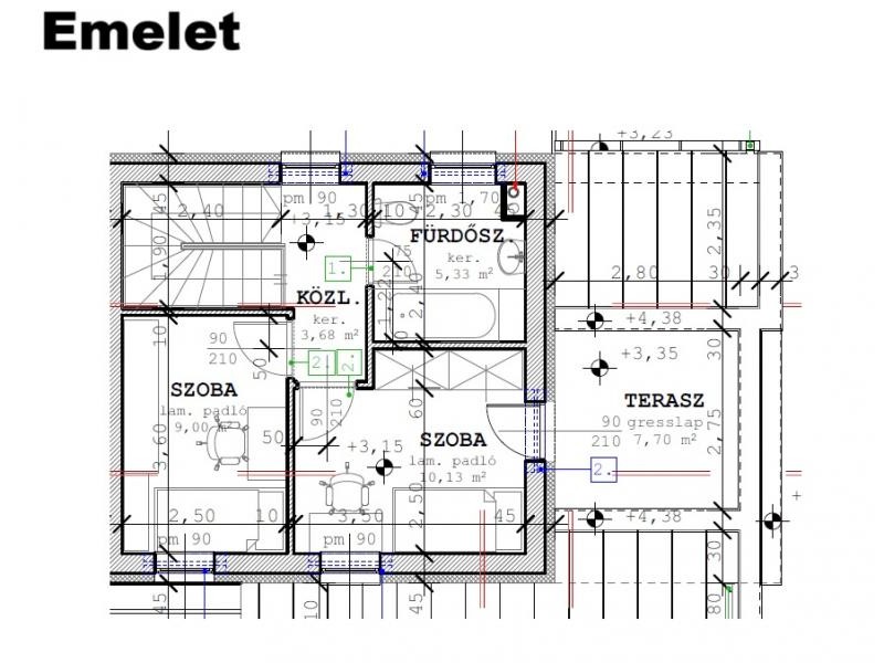 - emelet elosztása: 2 szoba, közlekedő, fürdő + WC, terasz