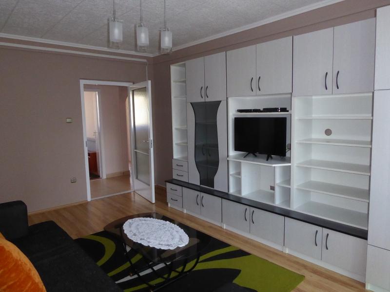 Tiszaújvárosban az Árpád úton kiadó 3. emeleti, 55 nm alapterületű, 2 szoba + gardrób elrendezésű, erkélyes, klímás, ízlésesen és teljes körűen berendezett lakás.
