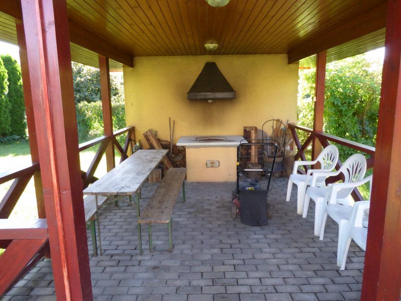 - nagyméretű, parkosított kertben sütő-főző rész került kialakításra a pergola alatt
