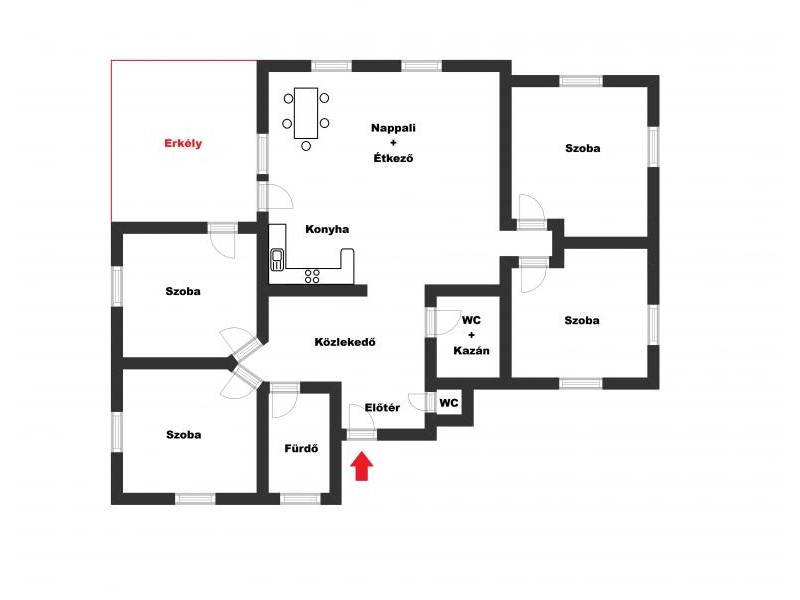 - elrendezése: 4 külön nyíló szoba, konyha – étkező - nappali, fürdő, 2 külön álló WC, előtér, közlekedő, erkély