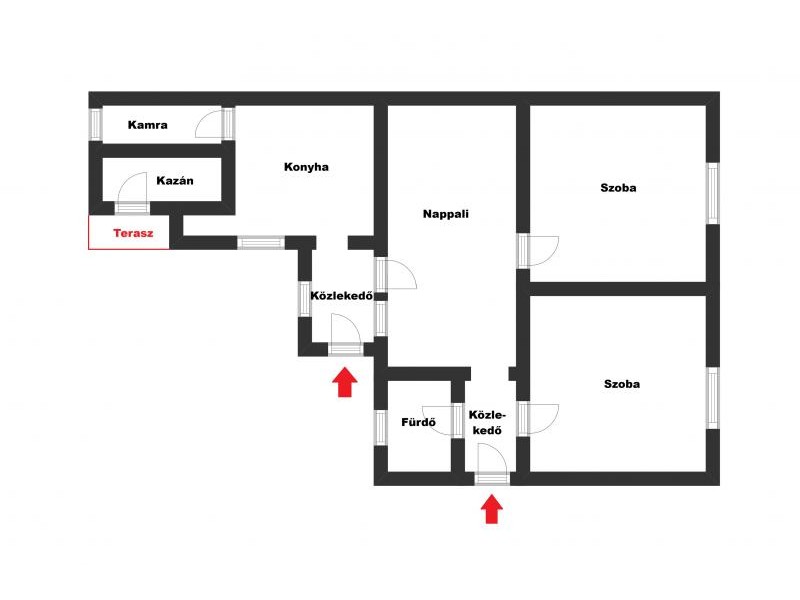 - 2 szoba + nappali, 2 közlekedő, konyha + étkező, fürdő + WC, kamra, kazánhelyiség elrendezésű