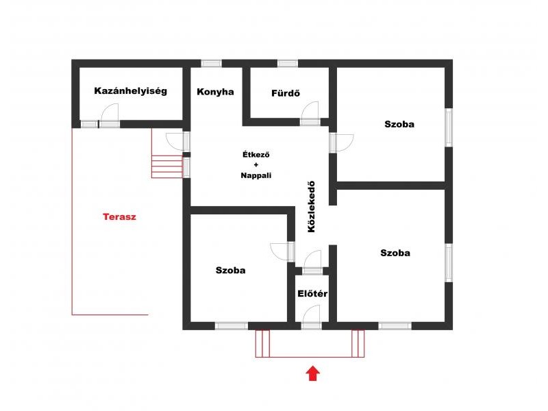 - elosztása: 3 szoba, konyha + étkező, fürdő + WC, közlekedő, előtér